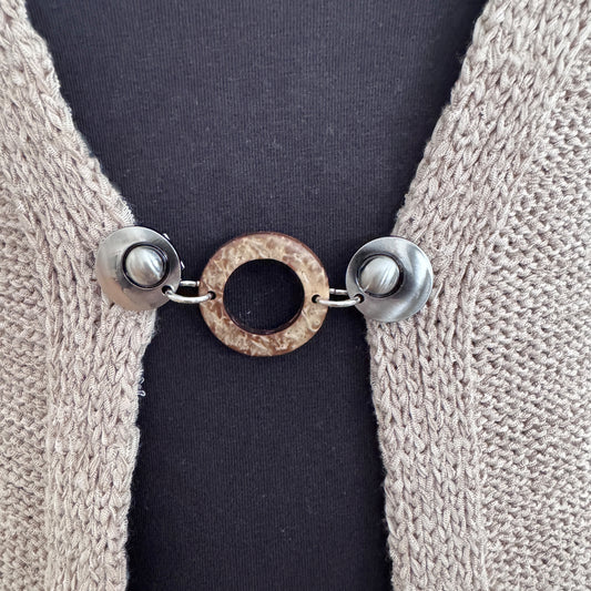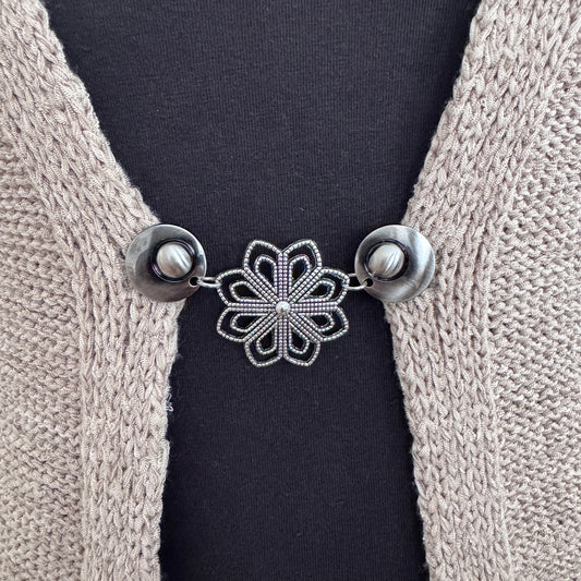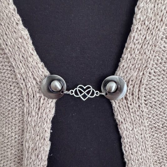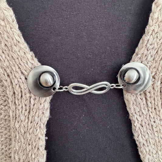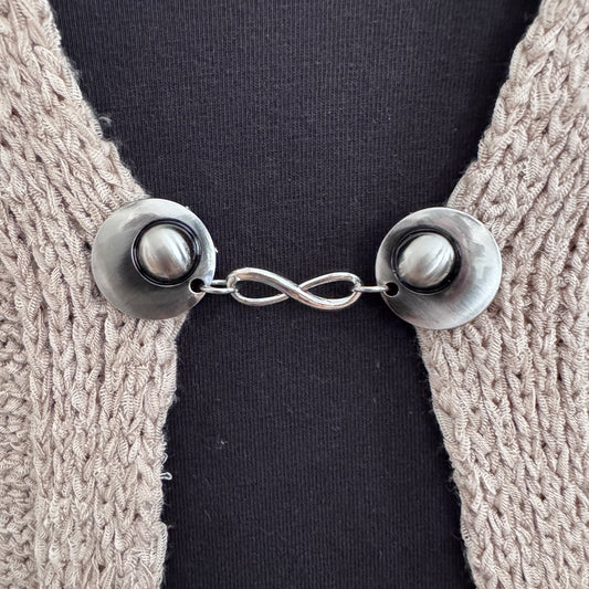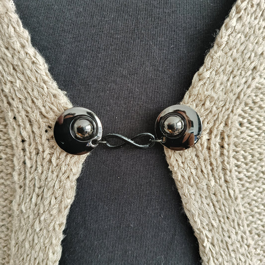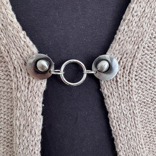 Deze basis vestsluitingen zijn onze klassiekers. Twee clips verbonden met een vaste bedel, handgemaakt in Groningen. Ideaal voor vesten, omslagdoeken en sjaals — decoratief én functioneel in gebruik.