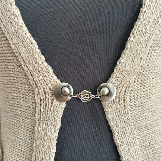 Deze basis vestsluitingen zijn onze klassiekers. Twee clips verbonden met een vaste bedel, handgemaakt in Groningen. Ideaal voor vesten, omslagdoeken en sjaals — decoratief én functioneel in gebruik.