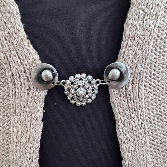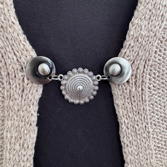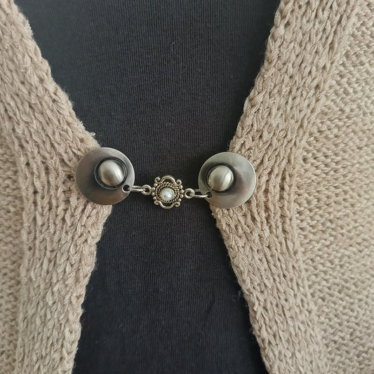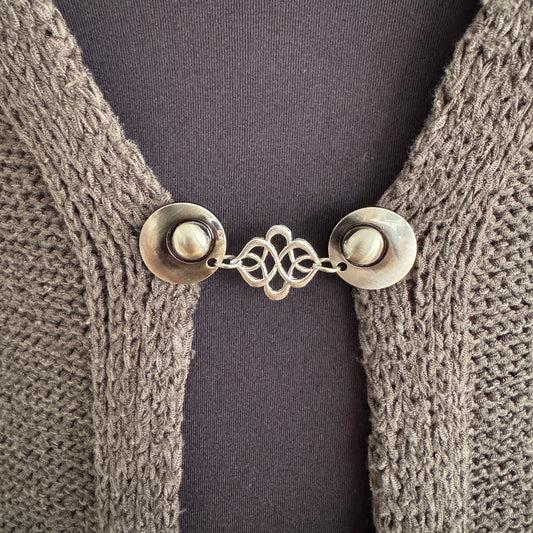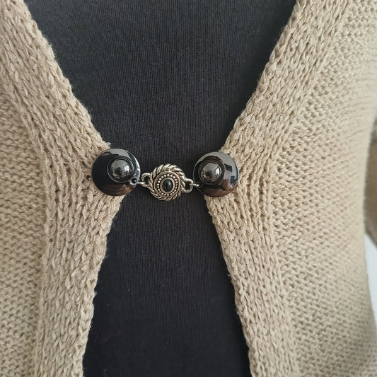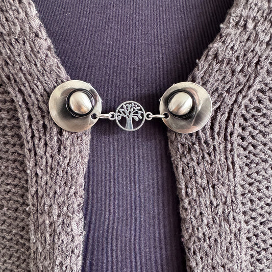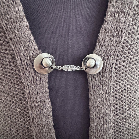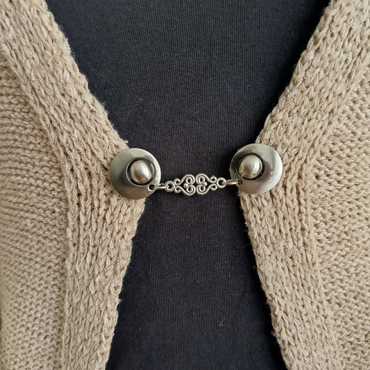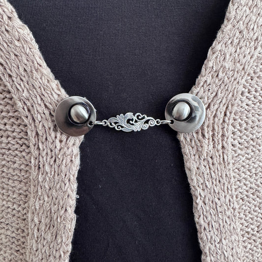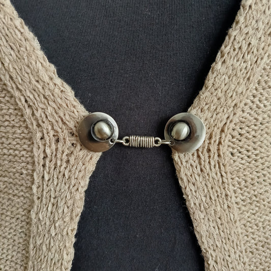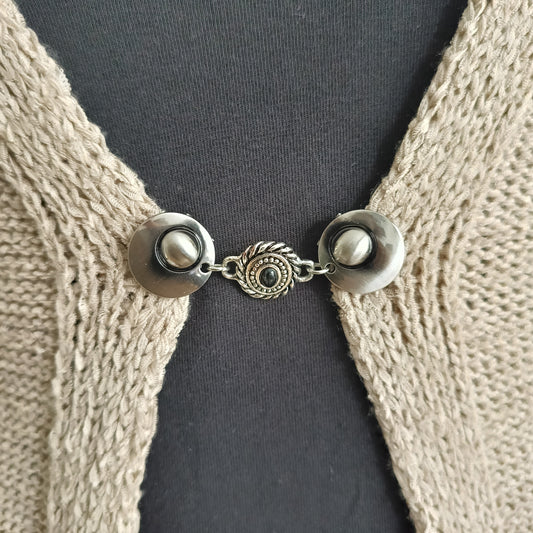 Deze basis vestsluitingen zijn onze klassiekers. Twee clips verbonden met een vaste bedel, handgemaakt in Groningen. Ideaal voor vesten, omslagdoeken en sjaals — decoratief én functioneel in gebruik.