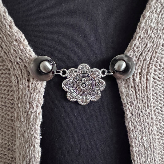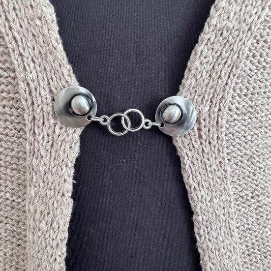 Deze basis vestsluitingen zijn onze klassiekers. Twee clips verbonden met een vaste bedel, handgemaakt in Groningen. Ideaal voor vesten, omslagdoeken en sjaals — decoratief én functioneel in gebruik.